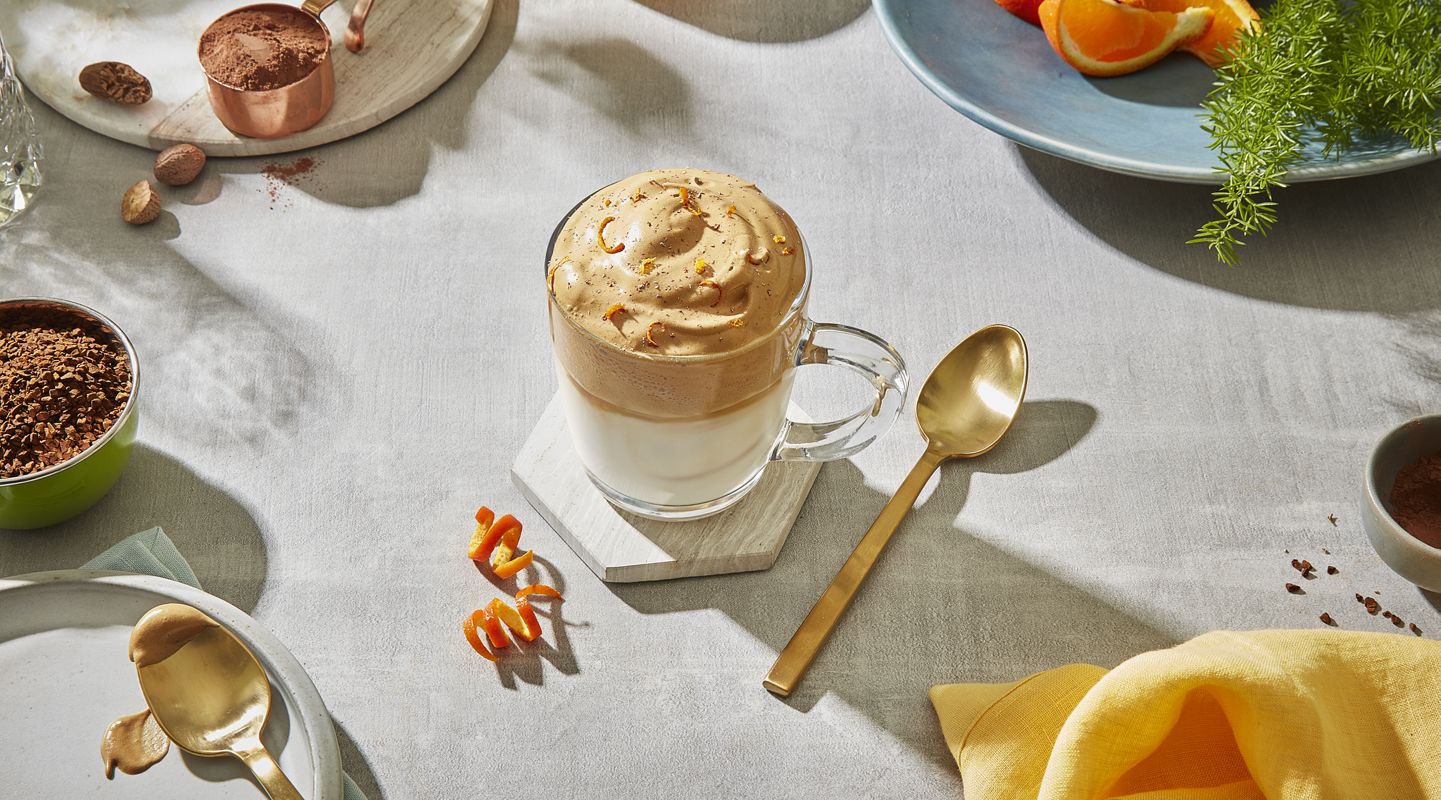 Dégustez l'été en concoctant un café Dalgona! Par sa simplicité et son goût onctueux, cette boisson glacée et fouettée est la nouvelle tendance de l'heure sur le web. À la saveur supérieure du café instantané Van Houtte®, on y ajoute les arômes lumineux d’orange et de muscade, ainsi qu’une bonne dose de cacao.
