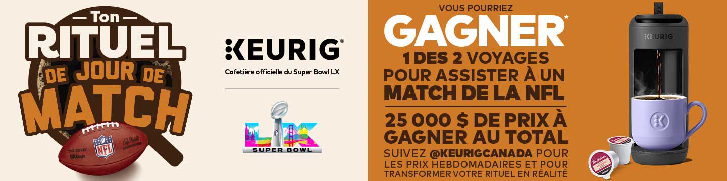 Vous pourriez gagner un des deux voyages pour assister à un match de la NFL. Vingt-cinq mille dollars de prix à gagner au total. Suivez Keurig Canada pour gagner des prix hebdomadaires et transformer votre rituel en réalité. Keurig est la cafetière officielle du Super Bowl LX.