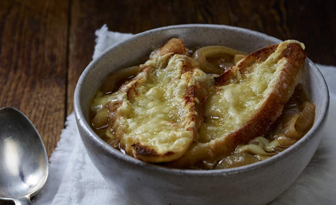 - Verser la soupe dans 6 bols, ajouter une tranche de pain sur chacun ainsi que le fromage. Griller au four.