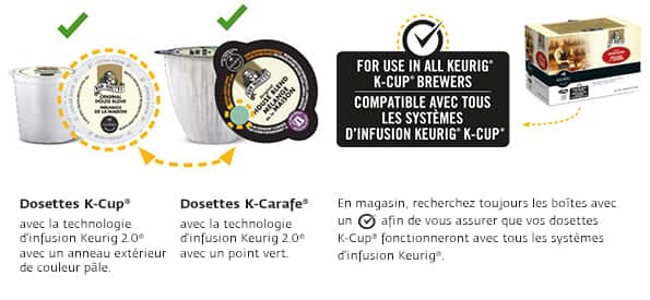Si vous avez d’anciennes dosettes Keurig® K-Cup® à la maison, elles ne fonctionneront peut-être pas dans les systèmes d’infusion Keurig® 2.0. Les dosettes K-Cup® portant l’anneau Keurig Brewed® sur l’opercule ont commencé à être disponibles en février 2014.